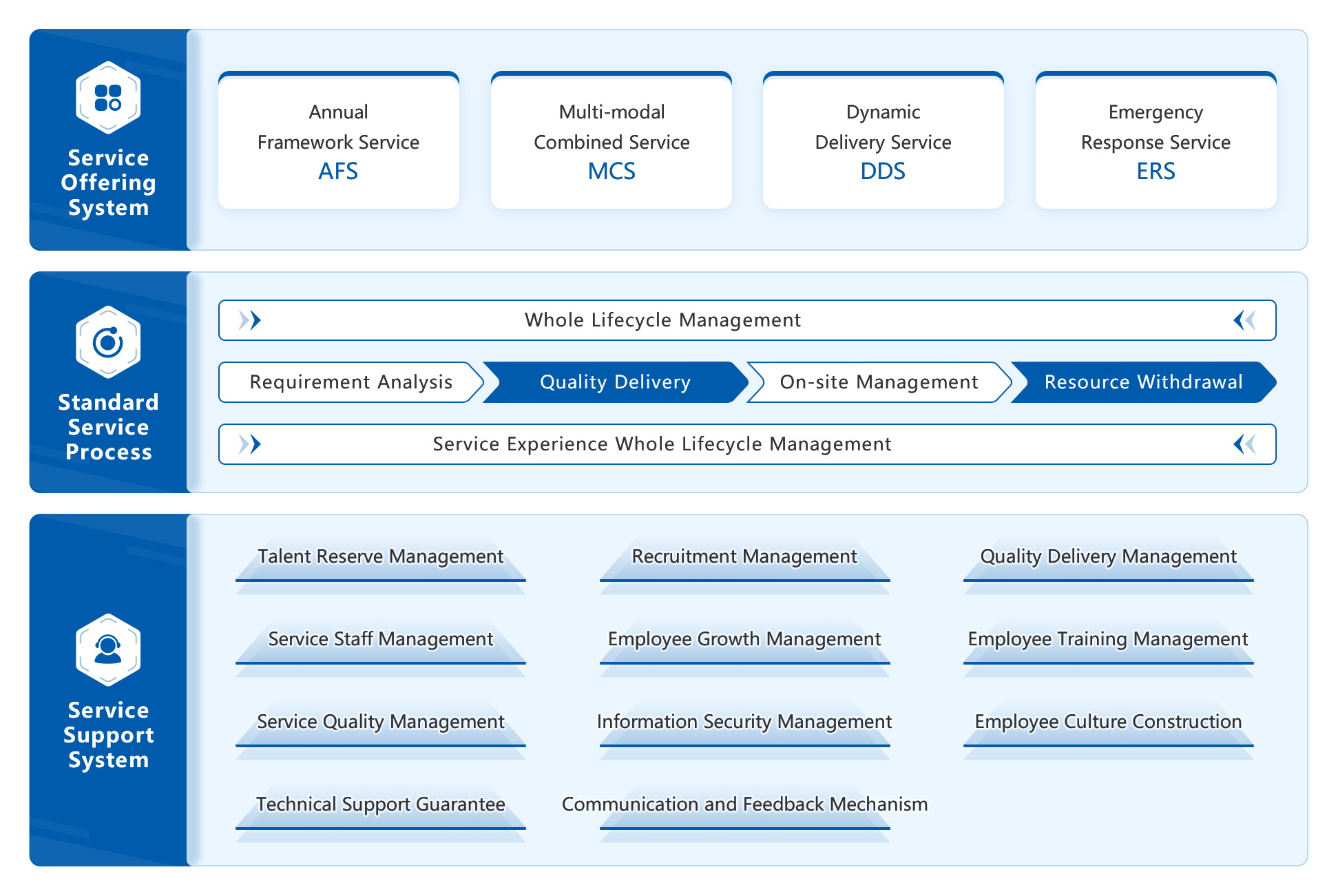 IT technical services for the whole life cycle are provided; a service offering system with AFS, MCS, DDS and ERS as the core has been formed; a perfect technical service support system is in place; and customized services, such as talent reserve pool, exclusive or resident special service consultants, etc., are provided to ensure delivery quality and ensure information security.